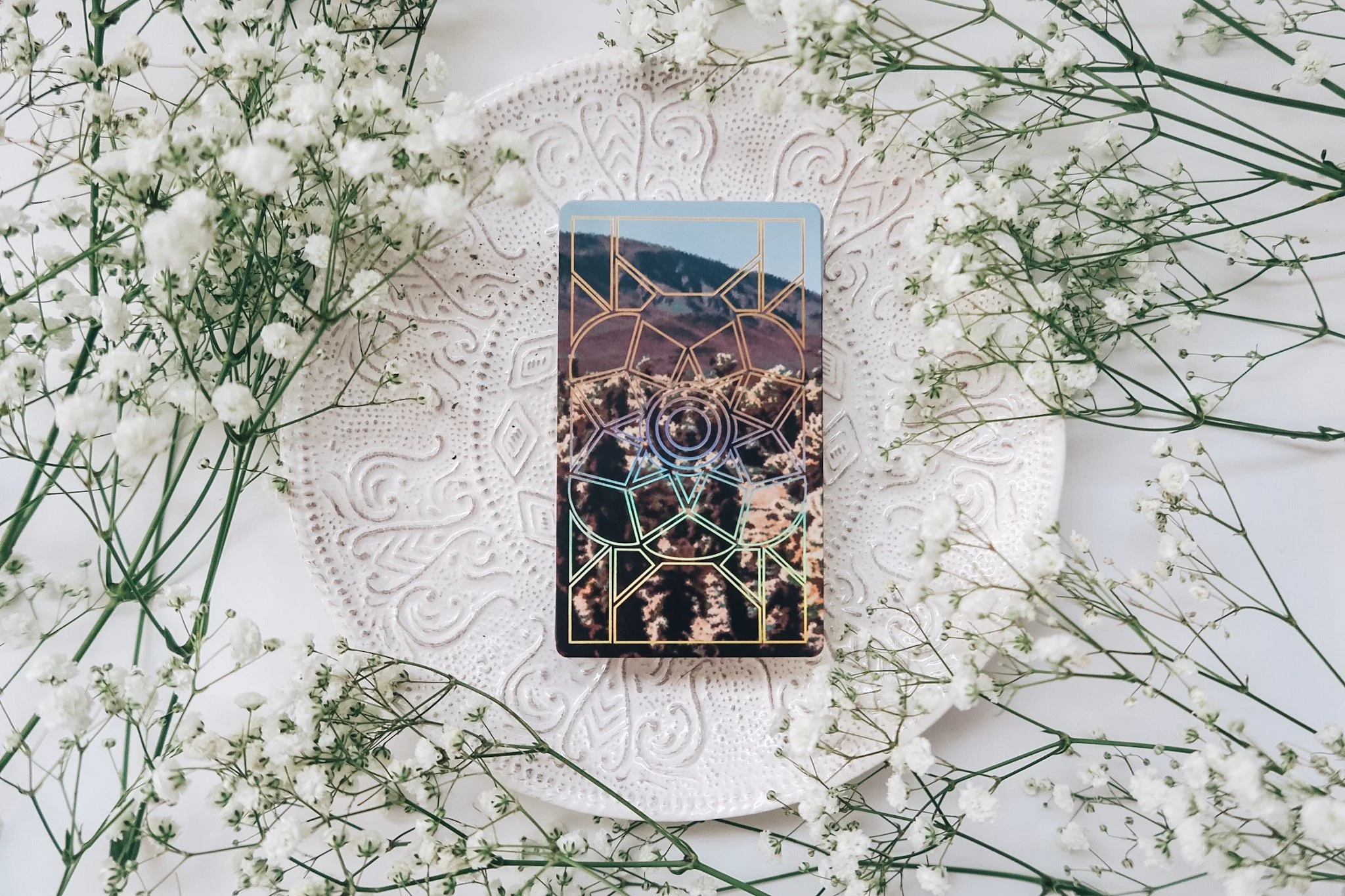 For the visual direction, I drew inspiration from Joshua Tree, a place that has always felt sacred, expansive, and otherworldly to me. I wanted to create a design language that felt simple but still held wonder. The card backs feature a custom abstract geometric pattern layered with psychedelic-edited desert photography, designed to evoke movement, light, and liminal energy. That aesthetic carried through into the packaging and guidebook as well.
