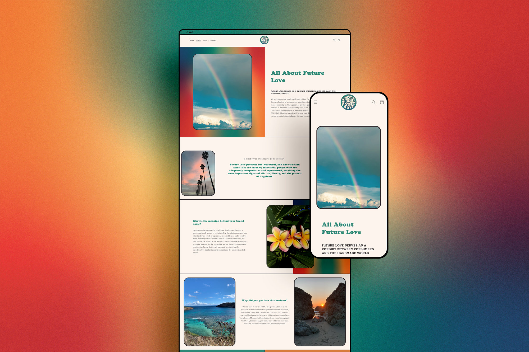 I designed and developed the site on Shopify using the Essencia theme by Standout Shopify as a base. It was the perfect starting point: clean, modern, and built with scalability in mind. From there, I customized the theme to feel distinctly “Future Love” through thoughtful design tweaks, interactive brand elements, and a color-rich, intuitive layout that guides users through the shopping experience with ease.